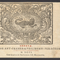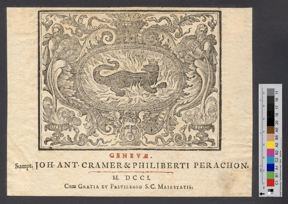 - GENEVAE. / Sumpt. JOH. ANT. CRAMER & PHILIBERTI PERACHON. / M. DCCI. / Cum GRATIA ET PRIVILEGIO S. C. MAIESTATIS.
