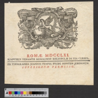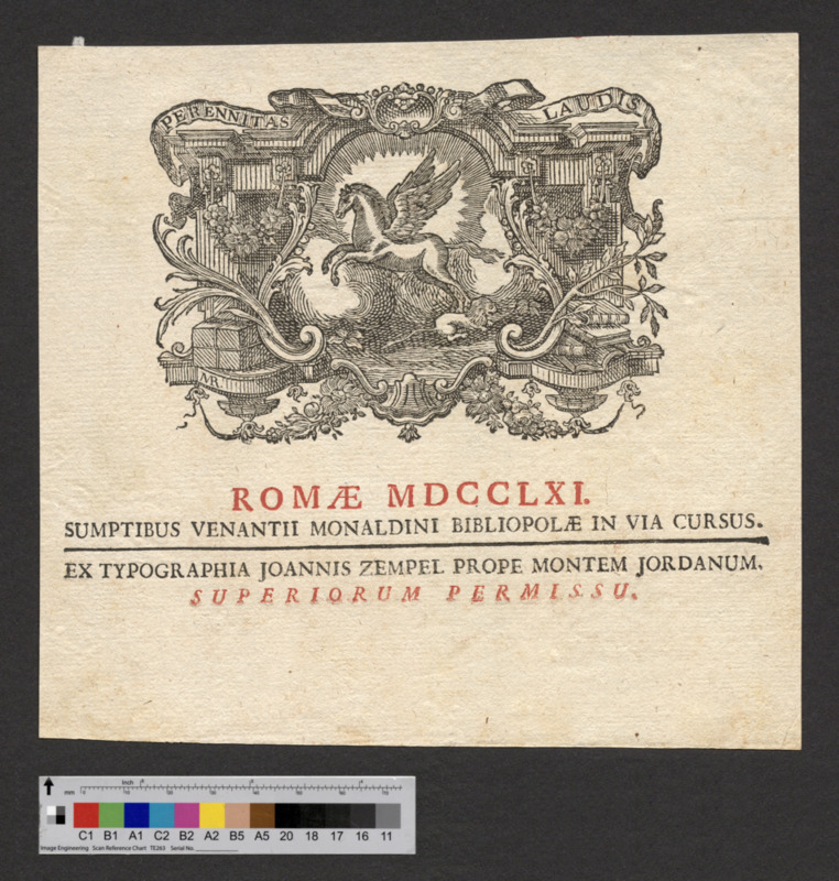 - ROMAE MDCCLXI. / SUMPTIBUS VENANTII MONALDINI BIBLIOPOLAE IN VIA CURSUS. / EX TYPOGRAPHIA JOANNIS ZEMPEL PROPE MONTEM JORADNUM. / SUPERIORUM PERMISSU.